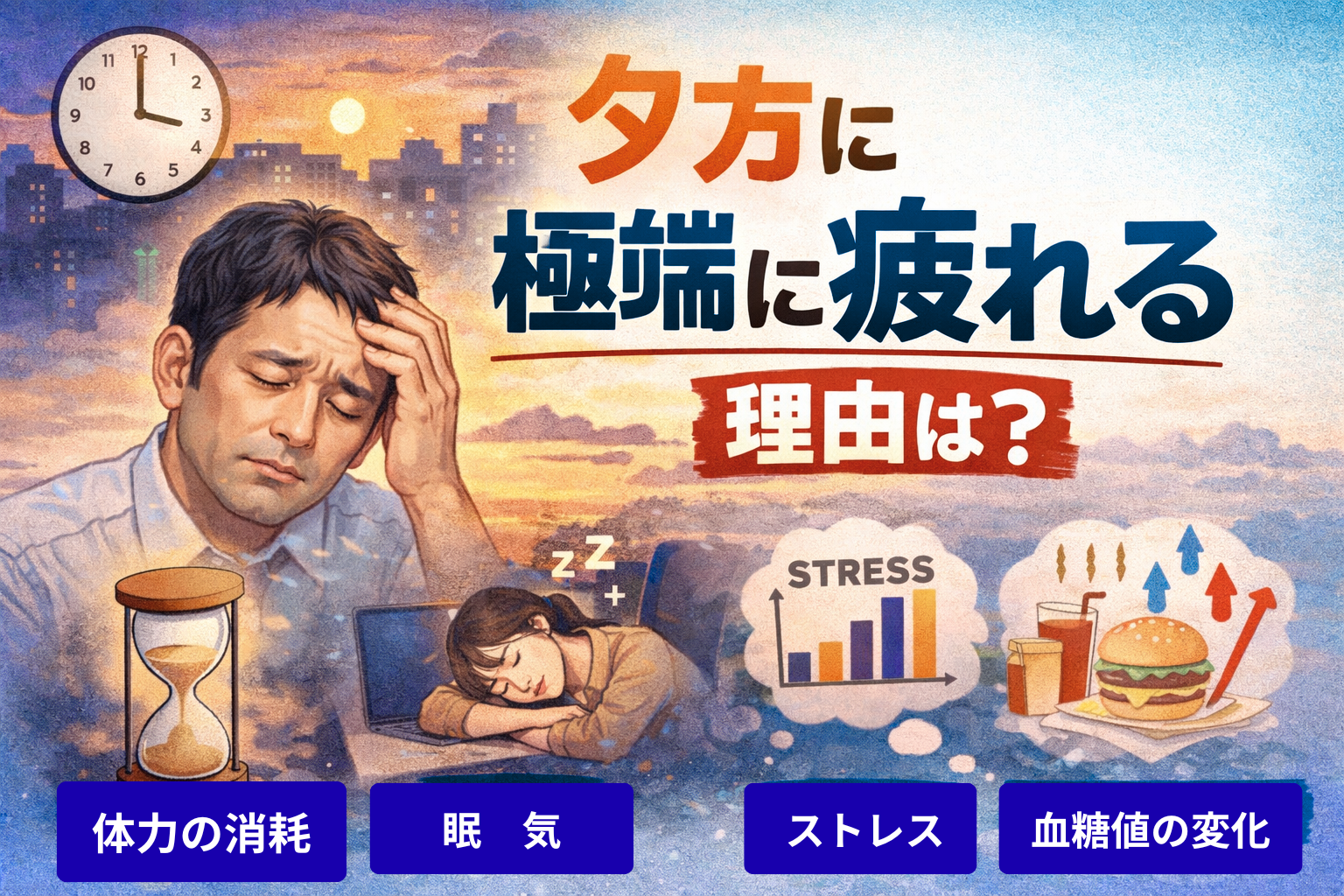 夕方に極端に疲れる状態とは、日中の後半になると急にだるさ、集中力低下、眠気、やる気低下などが強く出る状態を指します。これは病名ではなく症状の表現ですが、背景には睡眠と体内時計、ストレス反応、エネルギー代謝、ホルモン分泌のリズムが関わる可能性があります。